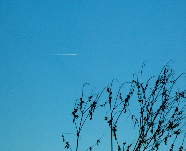 冬の晴れた空を、飛行機が雲を引き連れて飛んでいきます。