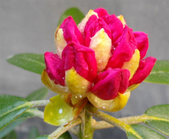 シャクナゲのつぼみが開きかけています。朝にしめった雨が、少し付いています。