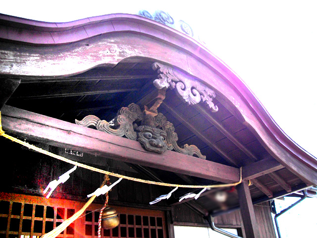 健速神社のおやしろです。ふと見上げたら、こんなところに恐い顔がありました。