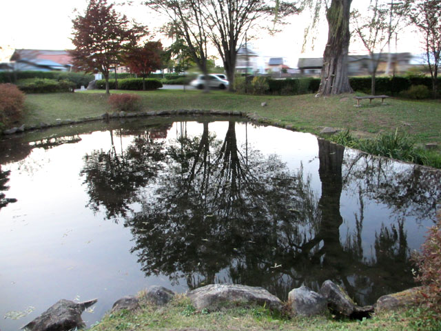 金井城(佐久市小田井)の堀。前方は湯川。後方は長野新幹線が通り、工場団地が広がっています。