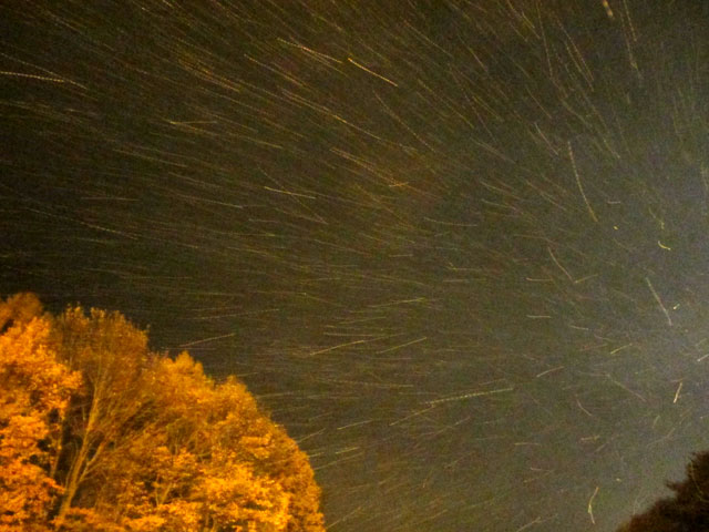 朝の雪が、風と雨に変わりました。落ち葉がフロントガラスに、こんなに付きました。