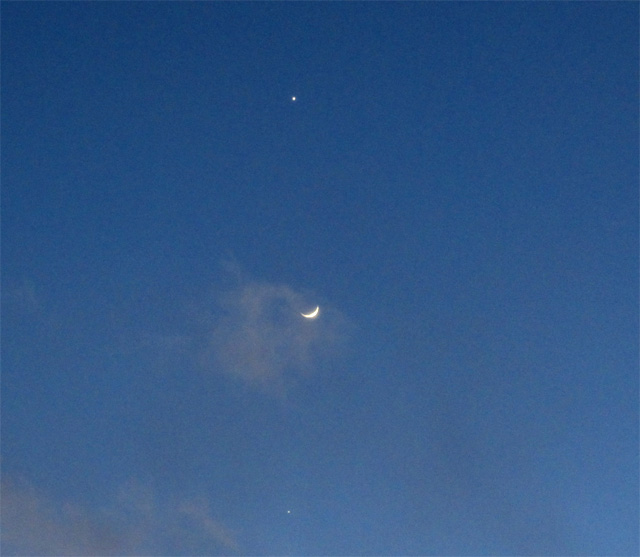 夕暮れどき。見上げる空に、金星さんと木星さん。間にお月さんが入って夢の共演。